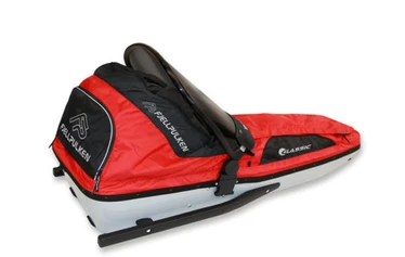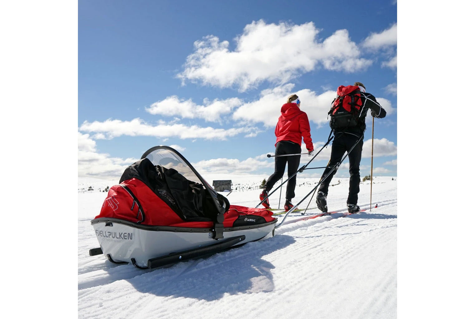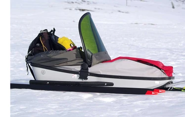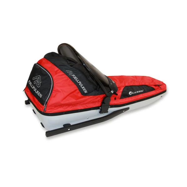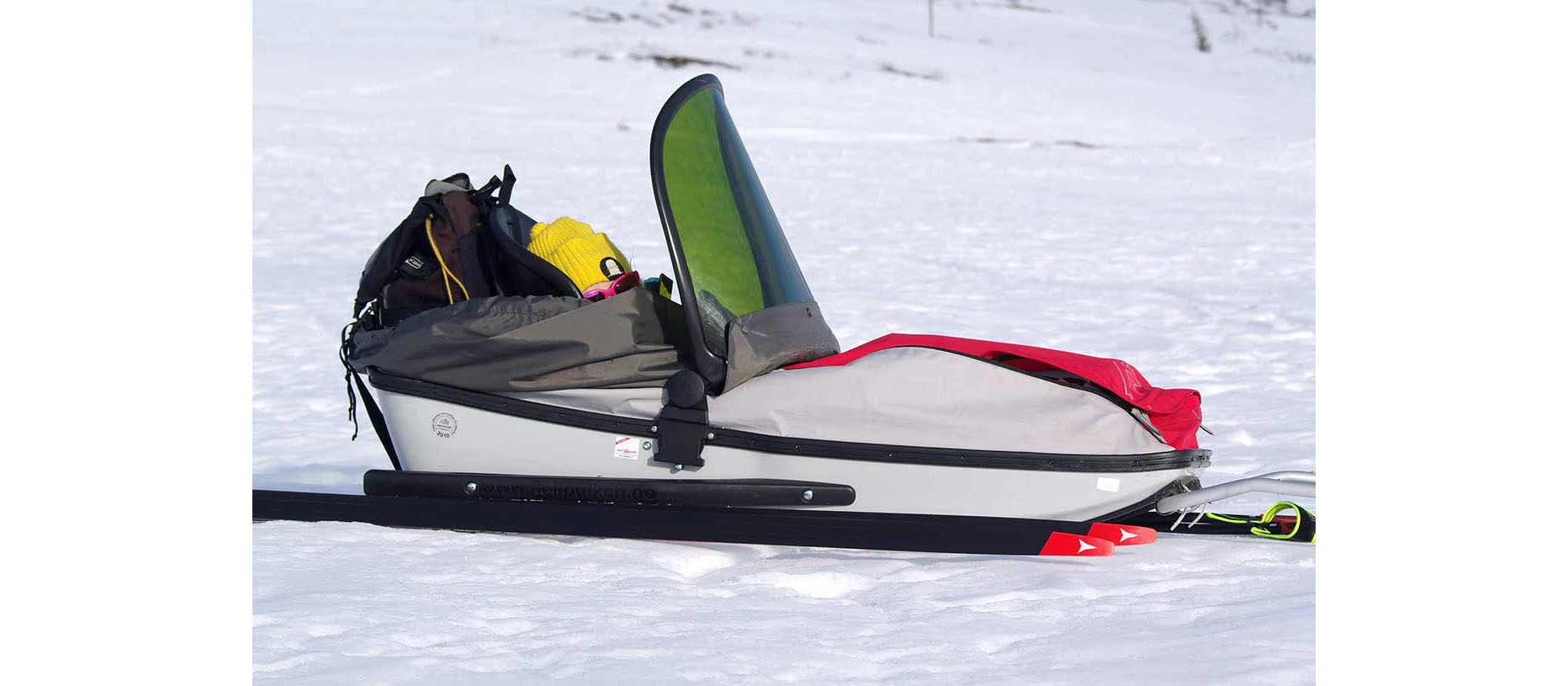 Fjellpulkenin laadukas lasten ahkio. Paremmin varusteltu kuin Savotan: istuin, kiinteä peite, tuulilasi, kiinteät H-aisat, vetovyö.